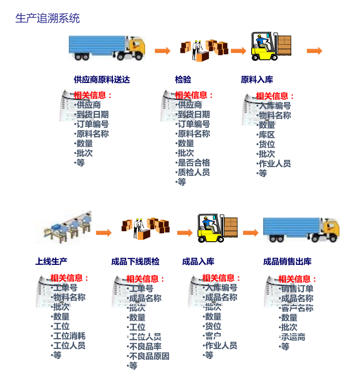 采用條碼或RFID芯片作為原料、成品身份標(biāo)識(shí),同時(shí)記錄批次信息;同時(shí)采用RF/RFID手持終端,條碼掃描槍作為數(shù)據(jù)采集裝置,記錄原料在送達(dá)一入庫檢驗(yàn)一入庫-上線生產(chǎn)加工一成品下線一質(zhì)檢-成品入庫銷售客戶直至承運(yùn)商全過程的相關(guān)信息,形成產(chǎn)品追溯體系。